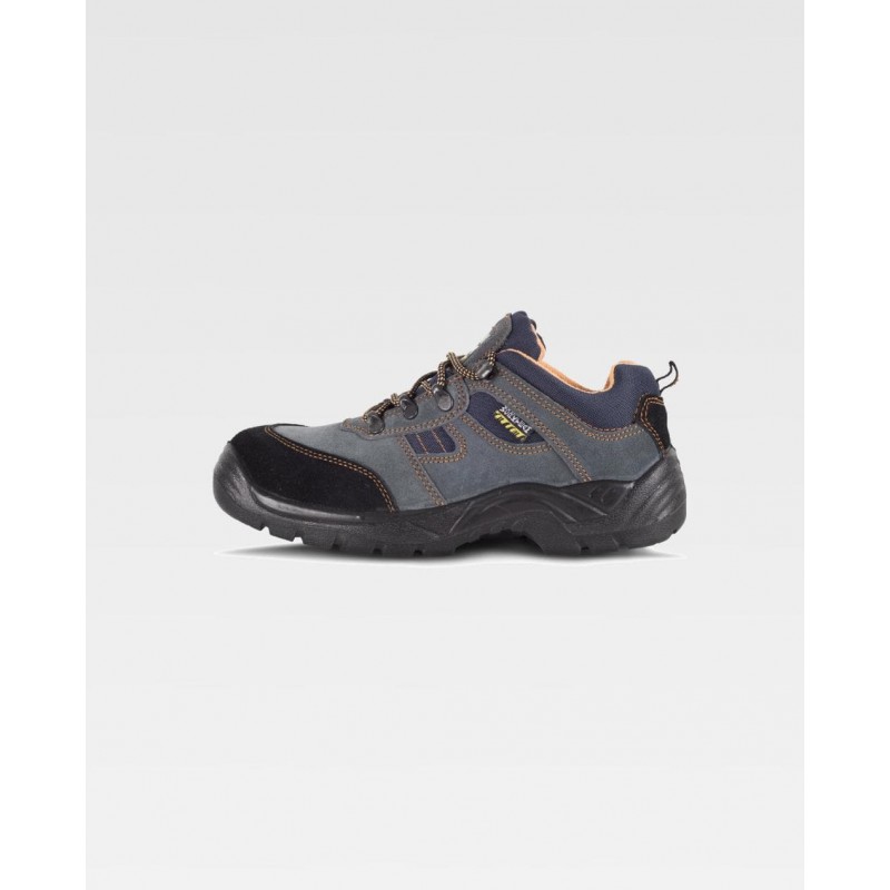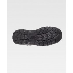 Sapato de croute com cordões. Tipo trekking. Sola PU bidensidade. Biqueira e palmilha de aço. Propriedades antiestáticas. Absorção da energia naz ona do salto. Resistente aos hidrocarbonetos. Resistente à perfurãçao. Resistência ao deslizamento sobre ladrilho cerâmico com dissolução de sabão e sobre aço com glicerina.